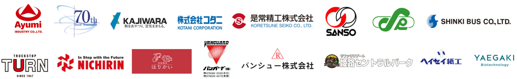 出展企業50音順/アユミ工業株式会社/株式会社井上鉄工所/株式会社KAJIWARA/株式会社コタニ/是常精工株式会社/三相電機株式会社/サンライズ工業株式会社/神姫バス株式会社/株式会社ターン/株式会社ニチリン/有限会社播磨海洋牧場/バンガード株式会社/バンシュー株式会社/姫路パークマネジメント株式会社/有限会社ヘイセイ紙工/ヤヱガキ醗酵技研株式会社